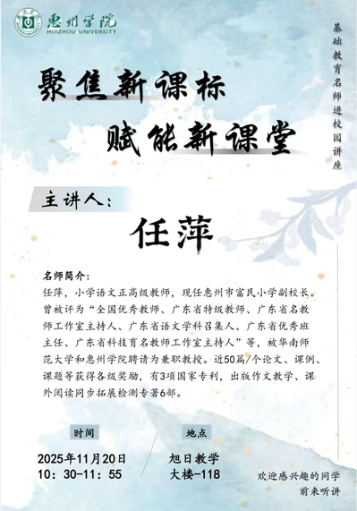 任萍,小学语文正高级教师,现任惠州市富民小学副校长。曾被评为“全国优秀教师、广东省特级教师、广东省名教师工作室主持人、广东省语文学科召集人、广东省优秀班主任、广东省科技育名教师工作室主持人”等,被华南师范大学和惠州学院聘请为兼职教授。近50篇/个论文、课例、课题等获得各级奖励,有3项国家专利,出版作文教学、课外阅读同步拓展检测专著6部。