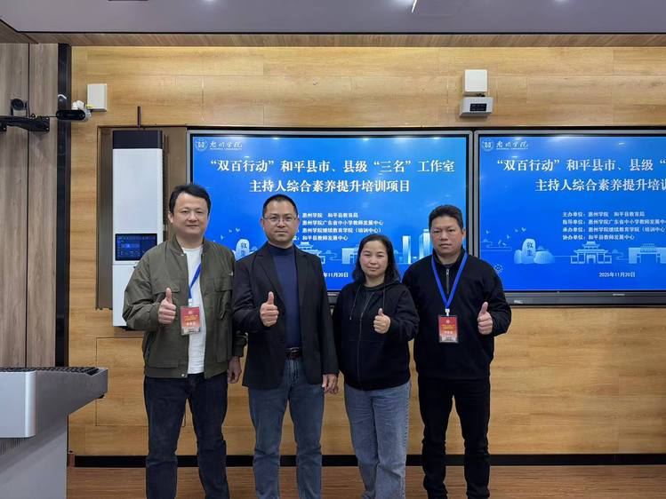 11月20日-22日,“双百行动”和平县市、县级“三名”工作室主持人综合素养提升培训项目在惠州学院开展。此期培训项目由惠州学院、和平县教育局联合主办,惠州学院广东省中小学教师发展中心指导,惠州学院继续教育学院、和平县教师发展中心承办,和平县18名市、县级“三名”工作室主持人及成员参加了研修活动。