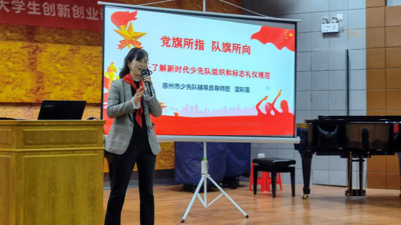 1月7日下午,音乐学院在音乐楼101排演厅为本院师生举办了一场名师进校园系列讲座。讲座以 《党旗所指 队旗所向--了解新时代少先队组织和标志礼仪规范》为主题,主讲人是惠州市第一小学大队辅导员、德育处副主任蓝彩莲老师。本次活动由教务处主办,音乐学院承办,由音乐学院副院长林碧炼主持。